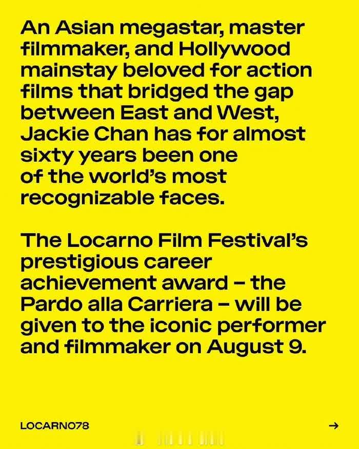 在光影交织的电影世界里,总有一些名字如璀璨星辰,永恒闪耀。成龙,无疑就是这样一位传奇人物。4月29日,娱乐圈传来重磅消息,成龙荣获第 78 届洛迦诺电影节终身成就奖,这一殊荣再次将他推向全球瞩目的焦点。